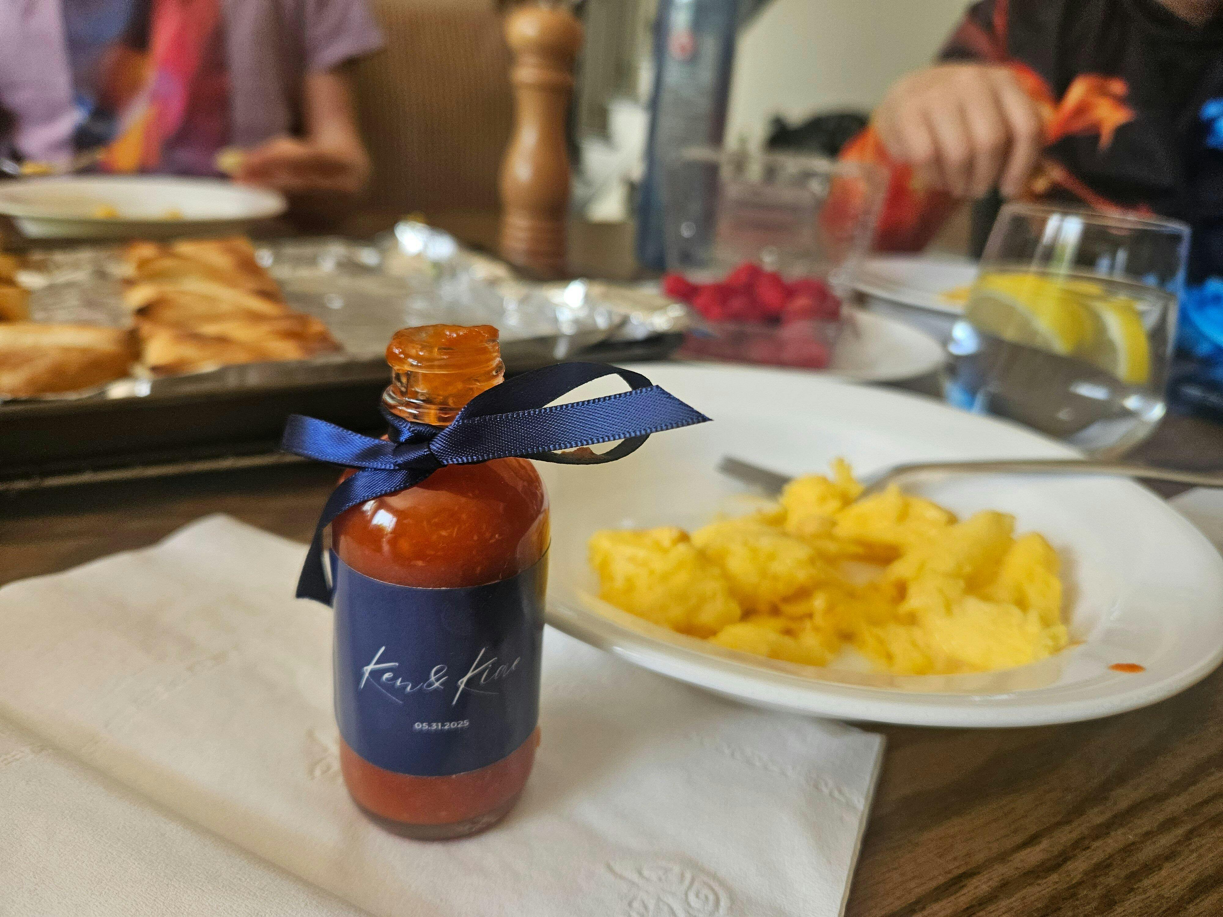 Ingredients: habaneros, scotch bonnets, red peppers, water, distilled vinegar, garlic, sugar, salt